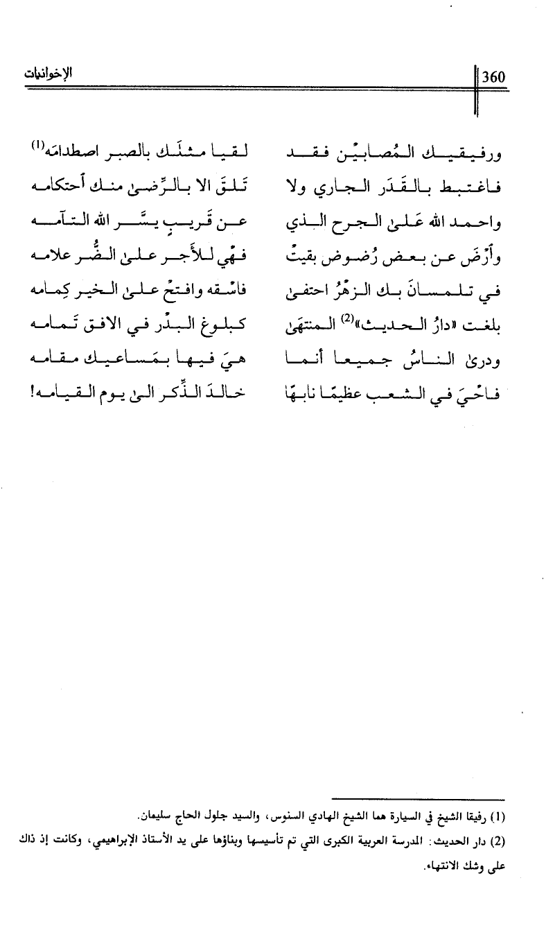 (2) دار الحديث: المدرسة العربية الكبرى التي تم تأسيسها وبناؤها على يد الأستاذ الإبراهيمي، وكانت إذ ذاك على وشك الانتهاء.