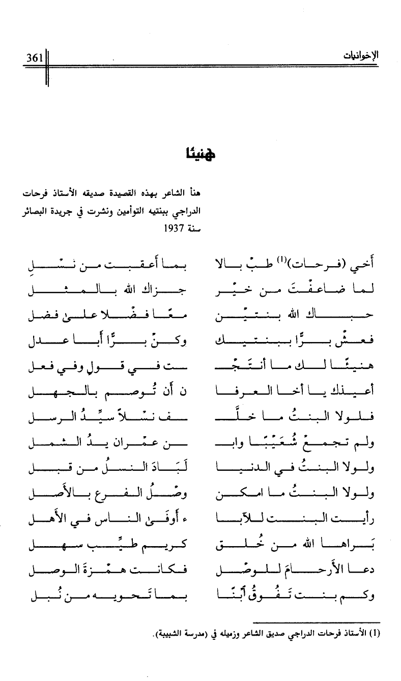 هنأ الشاعر بهذه القصيدة صديقه الأستاذ فرحات الدراجي ببنتيه التوأمين.