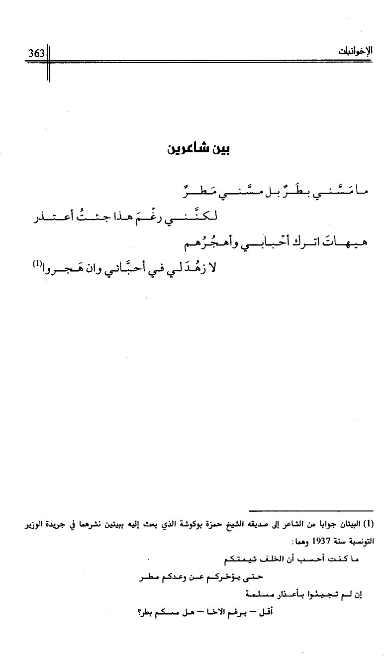 (1) البيتان جوابا من الشاعر إلى صديقه الشيخ حمزة بوكوشة الذي بعث إليه ببيتين نشرهما في جريدة الوزير التونسية سنة 1937 وهما: