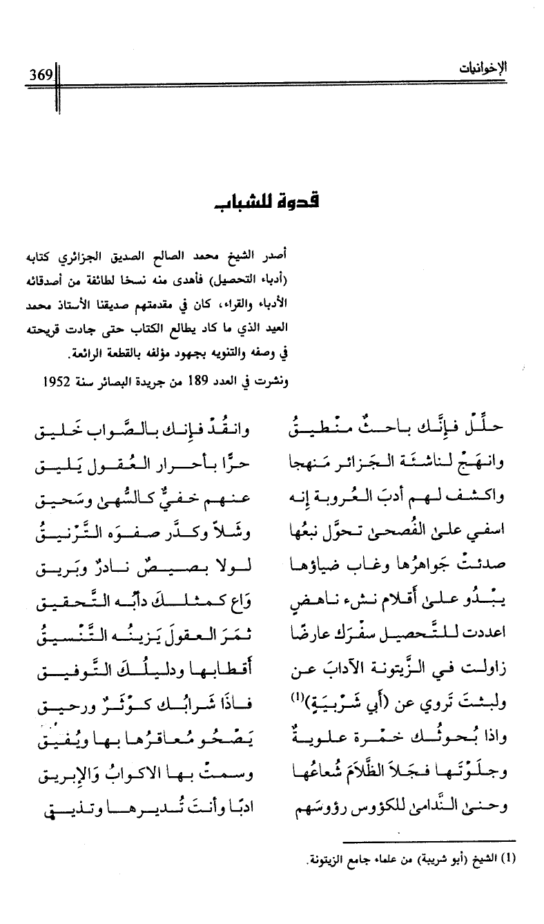 ونشرت في العدد 189 من جريدة البصائر سنة 1932.