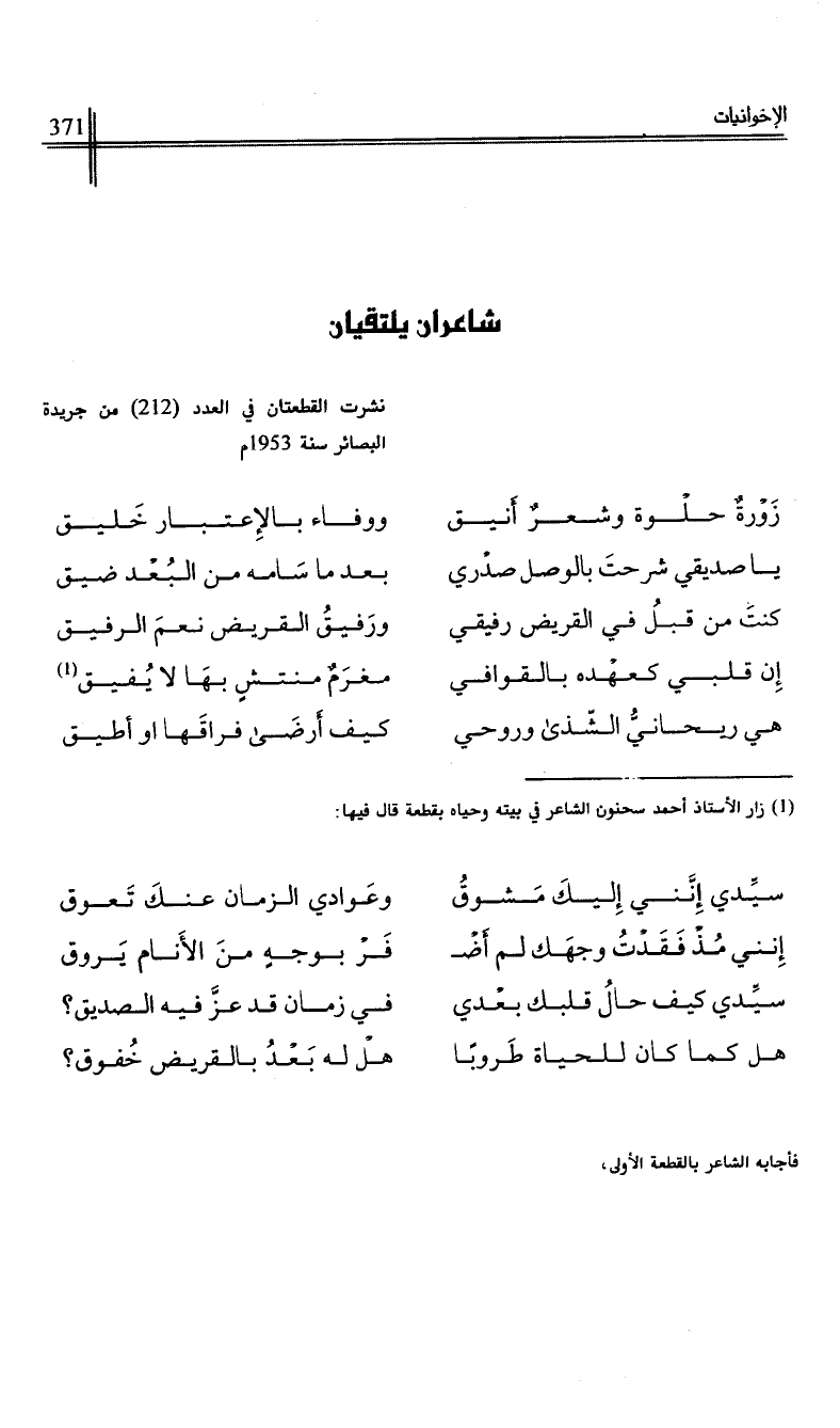 (1) زار الأستاذ أحمد سحنون الشاعر في بيته وحياه بقطعة قال فيها: