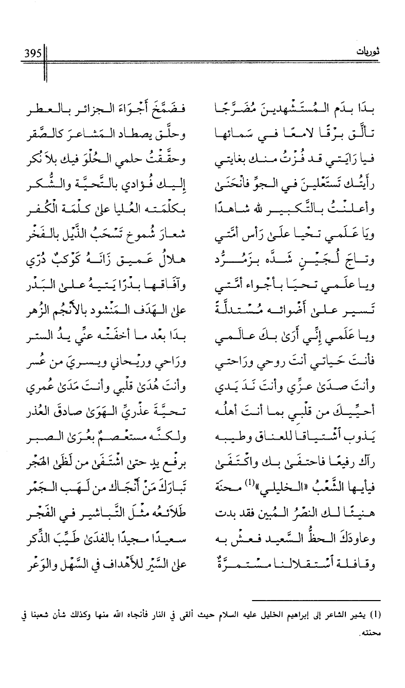 (1) يشير الشاعر إلى إبراهيم الخليل عليه السلام حيث ألقى في النار فأنجاه الله منها وكذلك شأن شعبنا في