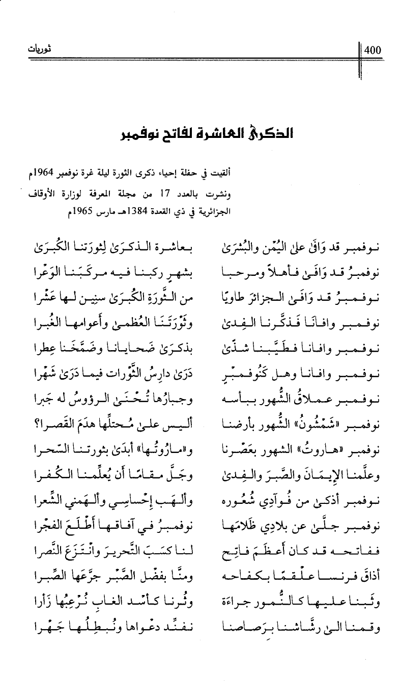 نوفمبر قد وافى الجزائر طاويا …*… من الثورة الكبرى سنين لها عشرا