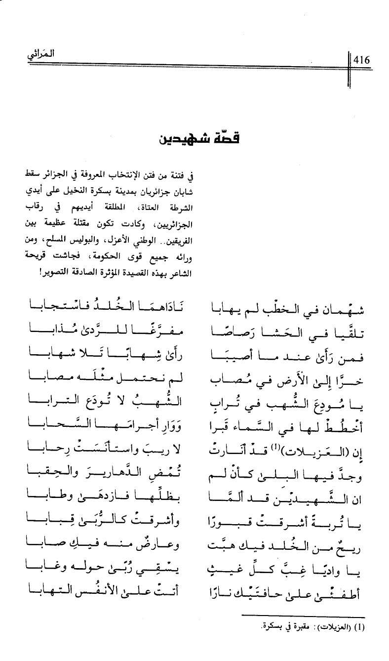 في فتنة من فتن الإنتخاب المعروفة في الجزائر سقط شابان جزائريان بمدينة بسكرة النخيل على أيدي الشرطة العتاة، المطلقة أيديهم في رقاب الجزائريين، وكادت تكون مقتلة عظيمة بين الفريقين .. الوطني الأعزل، والبوليس المسلح، ومن ورائه جميع قوى الحكومة، فجاشت قريحة الشاعر بهذه القصيدة المؤثرة الصادقة التصوير!