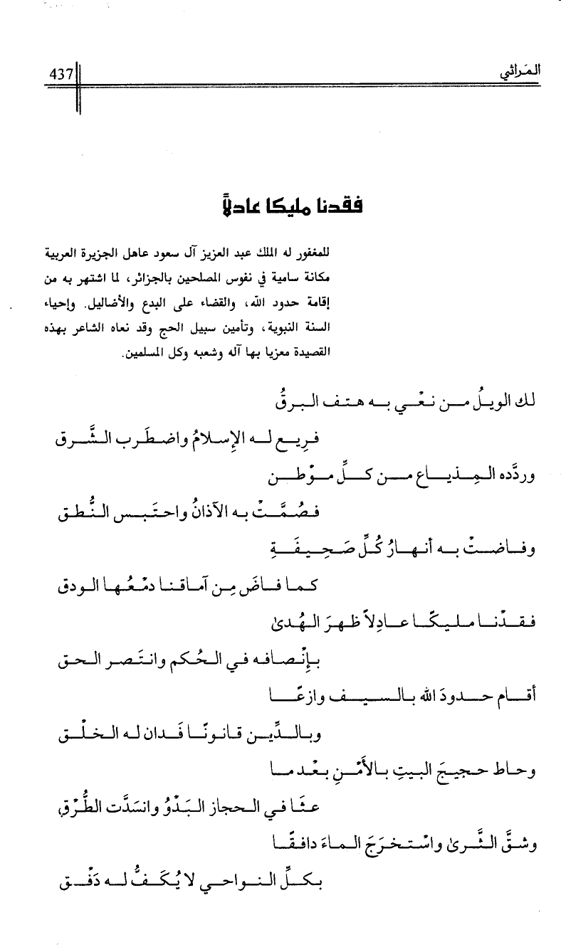 فقدنا مليكا عادلا ظهر الهدى …*… بإنصافه في الحكم وانتصر الحق