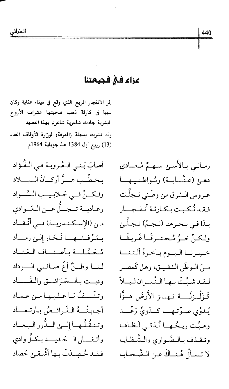 إثر الانفجار المريع الذي وقع في ميناء عنابة وكان سببا في كارثة ذهب ضحيتها عشرات الأرواح البشرية جادث شاعرية شاعرنا بهذا القصيد.