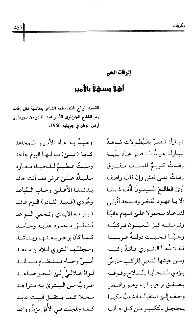 القصيد الرائع الني نظمه الشاعر بمناسبة نقل رفات رمز الكفاح الجزائري الأمير عبد القادر من سوريا إلى أرض الوطن في جويلية 1966م.