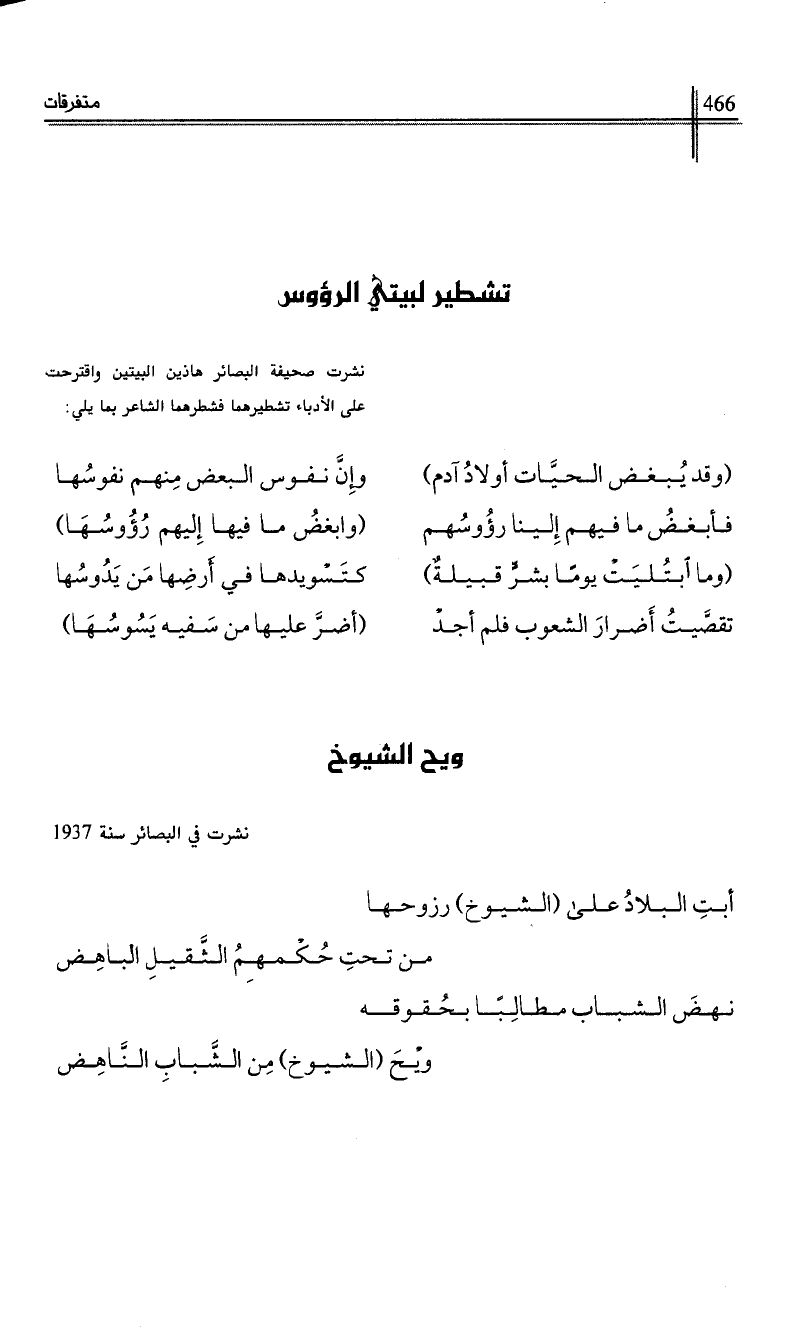 نشرت صحيفة البصائر هاذين البيتين واقترحت على الأدباء تشطيرهما فشطرهما الشاعر بما يلي: