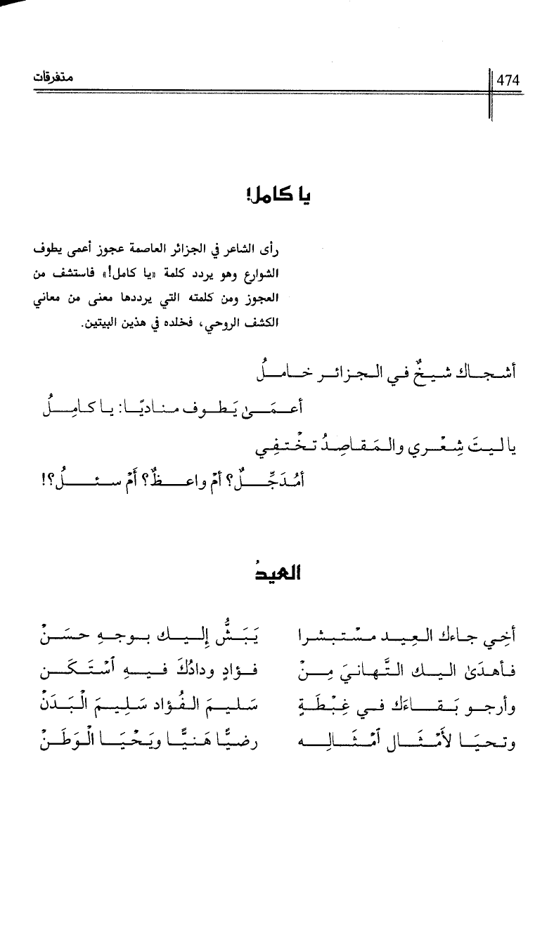 رأى الشاعر في الجزائر العاصمة عجوز أعمى يطوف الشوارع وهو يردد كلمة "يا كامل! " فاستشف من العجوز ومن كلمته التي يرددها معنى من معاني الكشف الروحي، فخلده في هذين البيتين.