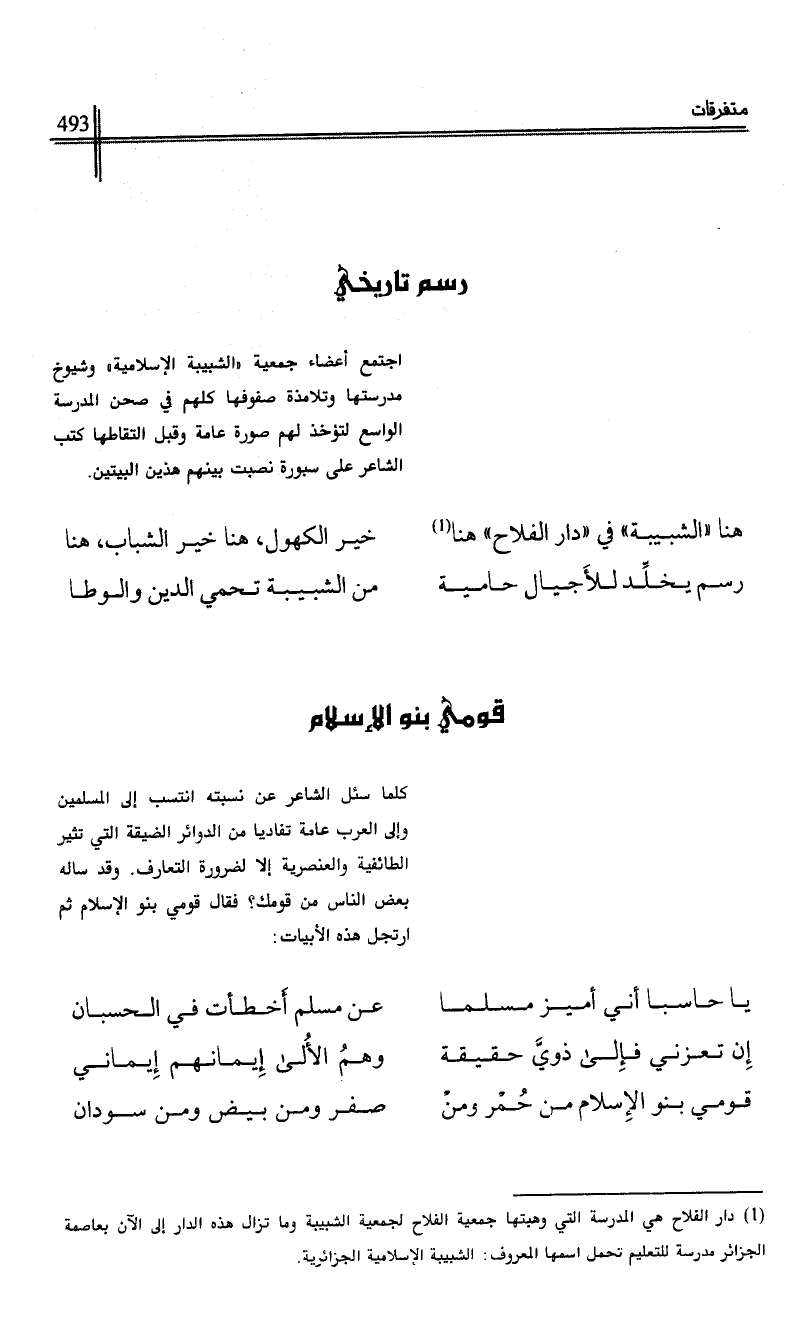 (1) دار الفلاح هي المدرسة التي وهبتها جمعية الفلاح لجمعية الشبيبة وما تزال هذه الدار إلى الآن بعاصمة الجزائر مدرسة للتعليم تحمل اسمها المعروف: الشبيبة الإسلامية الجزائرية.