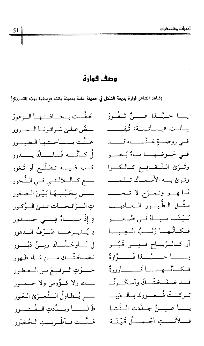 (شاهد الشاعر فوارة بديعة الشكل في حديقة عامة بمدينة باتنة فوصفها بهذه القصيدة)!