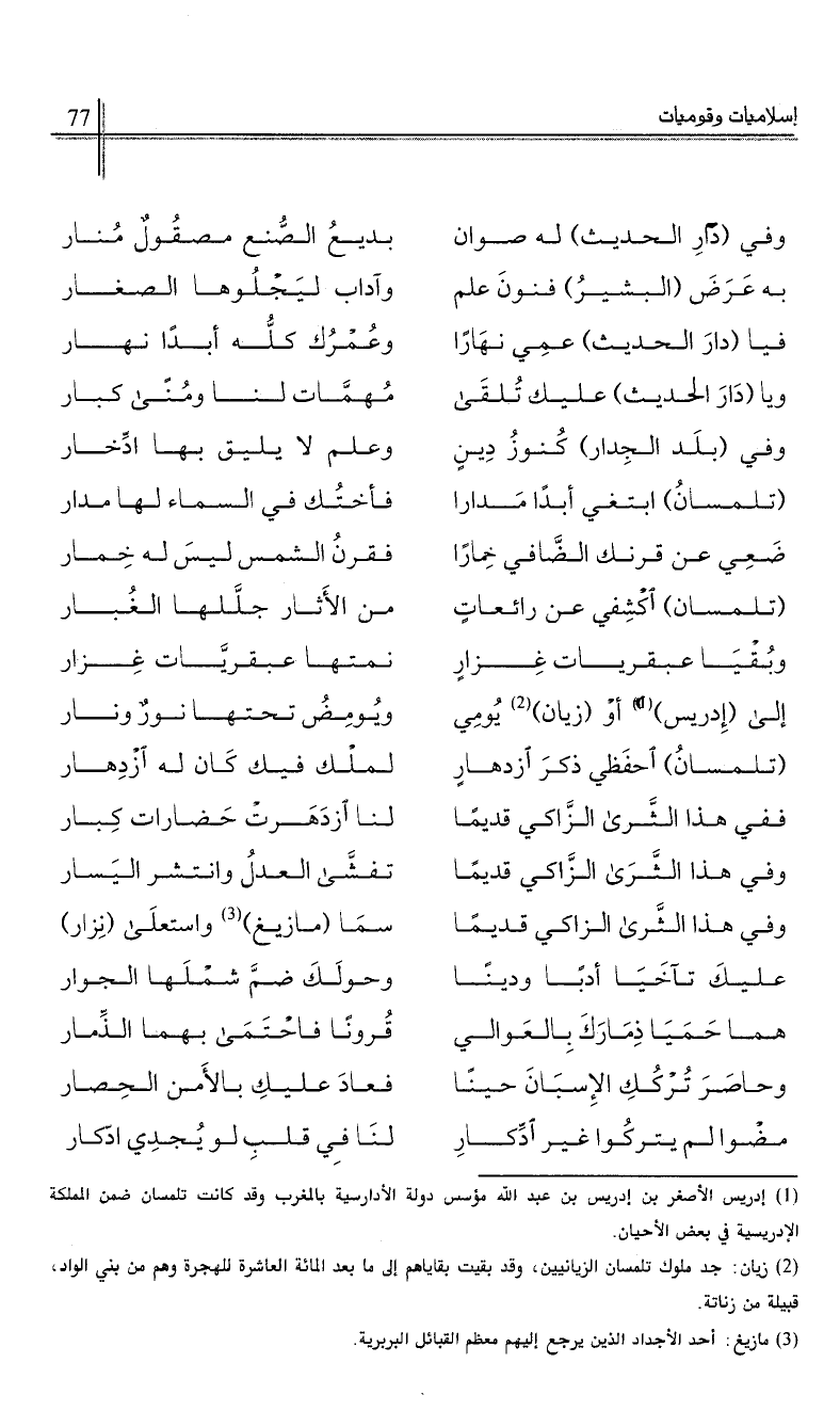 (2) زيان: جد ملوك تلمسان الزيانيين، وقد بقيت بقاياهم إلى ما بعد المائة العاشرة للهجرة وهم من بني الواد، قبيلة من زناتة.