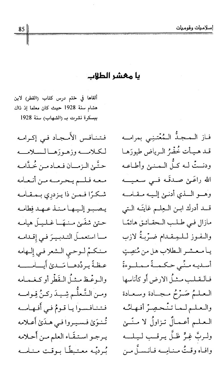 ألقاها في ختم درس كتاب (القطر) لابن هشام سنة 1928 حيث كان معلما إذ ذاك ببسكرة.