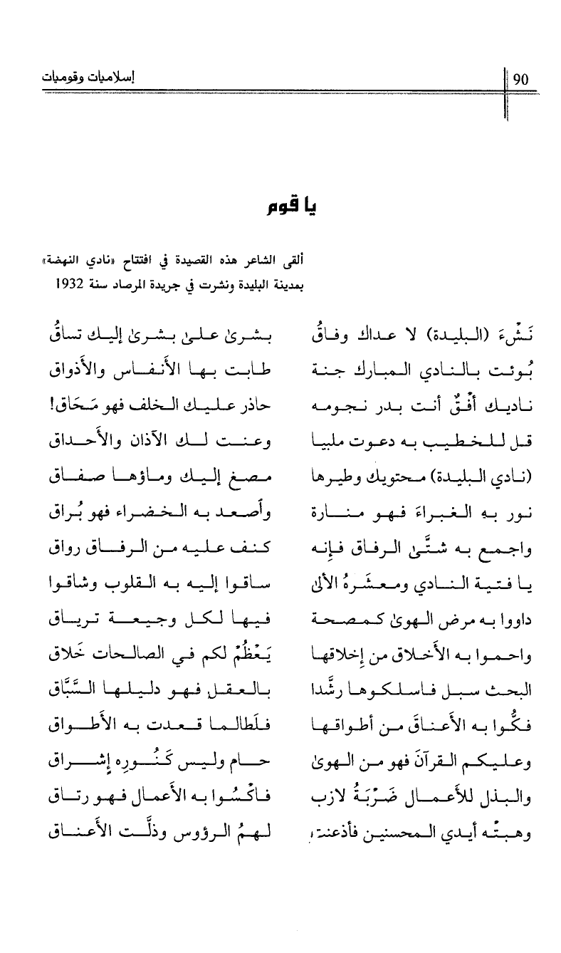 يا فتية النادي ومعشره الألى …*… ساقوا إليه به القلوب وشاقوا