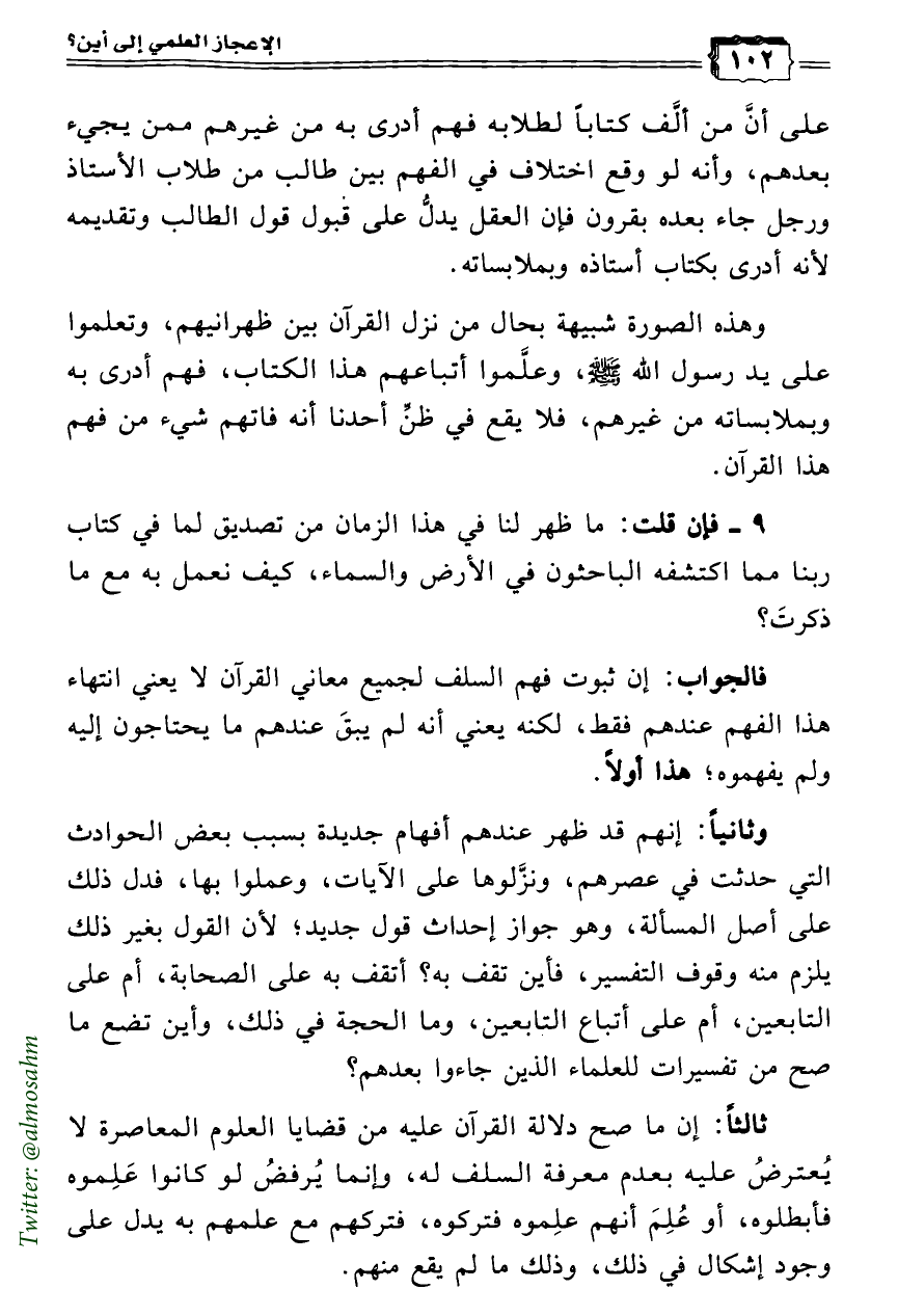 ثالثاً: إن ما صح دلالة القرآن عليه من قضايا العلوم المعاصرة لا يُعترضُ عليه بعدم معرفة السلف له، وإنما يُرفضُ لو كانوا عَلِموه فأبطلوه، أو عُلِمَ أنهم علِموه فتركوه، فتركهم مع علمهم به يدل على وجود إشكال في ذلك، وذلك ما لم يقع منهم.