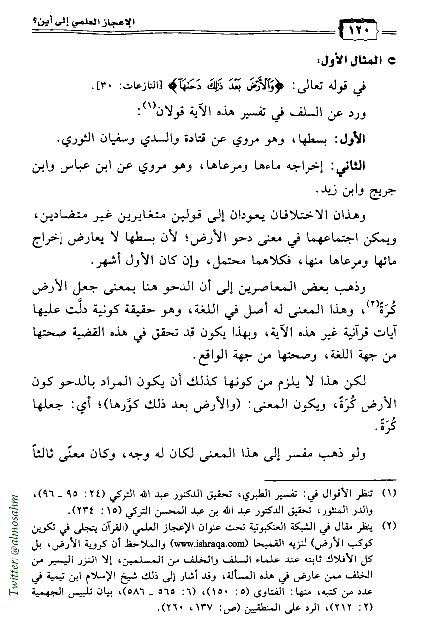 (¬2) ينظر مقال في الشبكة العنكبوتية تحت عنوان الإعجاز العلمي (القرآن يتجلى في تكوين كوكب الأرض) لنزيه القميحا (www.ishraqa.com) والملاحظ أن كروية الأرض، بل كل الأفلاك ثابته عند علماء السلف والخلف من المسلمين، إلا النزر اليسير من الخلف ممن عارض في هذه المسألة، وقد أشار إلى ذلك شيخ الإسلام ابن تيمية في عدد من كتبه، منها: الفتاوى (5: 150)، (6: 565 - 586)، بيان تلبيس الجهمية (2: 212)، الرد على المنطقيين (ص: 137، 260).