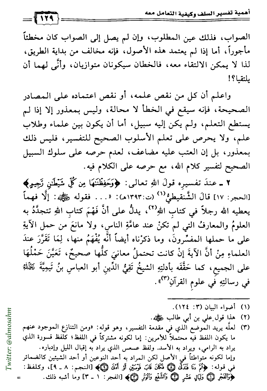 2 - عندَ تفسيرِه قولَ اللهِ تعالى: {وَحَفِظْنَاهَا مِنْ كُلِّ شَيْطَانٍ رَجِيمٍ} [الحجر: 17] قالَ الشَّنقيطيُّ (¬1) (ت:1393هـ): «... فقوله رضي الله عنه: إلاَّ فهماً يعطيه الله رجلاً في كتابِ اللهِ (¬2)، يدلُّ على أنَّ فَهْمَ كتابِ اللهِ تتجدَّدُ به العلومُ والمعارفُ التي لم تكنْ عند عامَّةِ الناسِ، ولا مانعَ من حمل الآيةِ على ما حملها المفسِّرونَ، وما ذكرْناه أيضاً أنَّه يُفْهَمُ منها، لِمَا تَقَرَّرَ عندَ العلماءِ مِنْ أنَّ الآيةَ إنْ كانت تحتملُ معانيَ كلُّها صحيحٌ، تَعَيَّنَ حَمْلُهَا على الجميعِ، كما حَقَّقَه بأدلتِهِ الشيخُ تَقِيُّ الدِّينِ أبو العباسِ بنُ تَيمِيَّةَ رحمه الله في رسالتِهِ في علومِ القرآنِ (¬3)».
