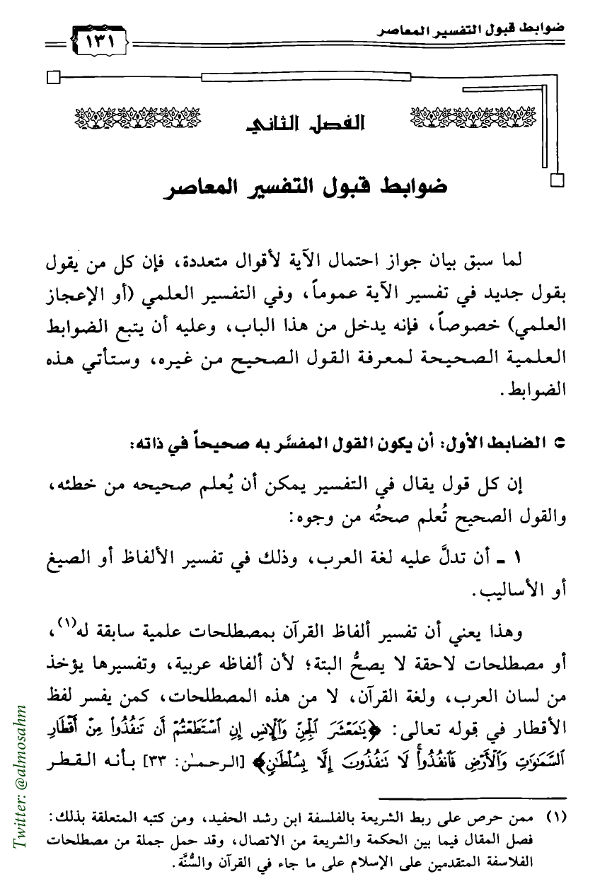 وهذا يعني أن تفسير ألفاظ القرآن بمصطلحات علمية سابقة له (¬1)، أو مصطلحات لاحقة لا يصحُّ البتة؛ لأن ألفاظه عربية، وتفسيرها يؤخذ من لسان العرب، ولغة القرآن، لا من هذه المصطلحات، كمن يفسر لفظ الأقطار في قوله تعالى: {يَامَعْشَرَ الْجِنِّ وَالإِنْسِ إِنِ اسْتَطَعْتُمْ أَنْ تَنْفُذُوا مِنْ أَقْطَارِ السَّمَاوَاتِ وَالأَرْضِ فَانْفُذُوا لاَ تَنْفُذُونَ إِلاَّ بِسُلْطَانٍ} [الرحمن: 33] بأنه القطر