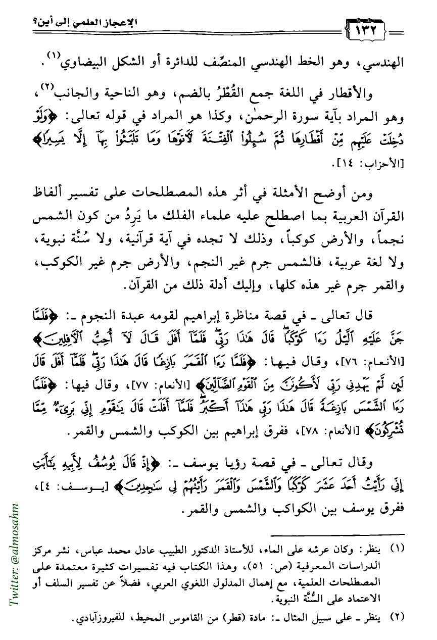 (¬1) ينظر: وكان عرشه على الماء، للأستاذ الدكتور الطبيب عادل محمد عباس، نشر مركز الدراسات المعرفية (ص: 51)، وهذا الكتاب فيه تفسيرات كثيرة معتمدة على المصطلحات العلمية، مع إهمال المدلول اللغوي العربي، فضلاً عن تفسير السلف أو الاعتماد على السُّنَّة النبوية.