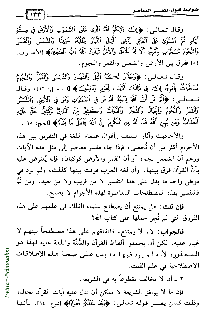 والأحاديث وآثار السلف وأقوال علماء اللغة في التفريق بين هذه الأجرام أكثر من أن تُحصى، فإذا جاء مفسر معاصر إلى مثل هذه الآيات وزعم أن الشمس نجم، أو أن القمر والأرض كوكبان، فإنه يُعترض عليه بأنَّ القرآن فرق بينها، وأن لغة العرب فرقت بينها كذلك، ولم يرد في موطن واحد ما يدل على هذا التفسير لا من قريب ولا من بعيد، ومن ثَمَّ فالتفسير بهذه المصطلحات المعاصرة لهذه الأجرام لا يصلح.
