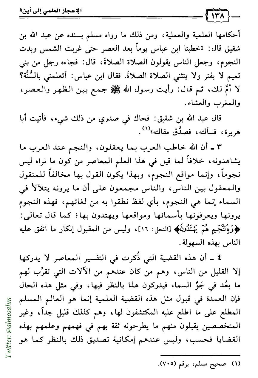 4 - أن هذه القضية التي ذُكرت في التفسير المعاصر لا يدركها إلا القليل من الناس، وهم من كان عندهم من الآلات التي تقرِّب لهم ما بعُد في جَوِّ السماء فيدركون هذا بالنظر فيها، وفي مثل هذه الحال فإن العمدة في قبول مثل هذه القضية العلمية إنما هو العالم المسلم المطلع على ما اطلع عليه المكتشفون لها، وهم كذلك قليل جداً، وغير المتخصصين يقبلون منهم ما يطرحونه ثقة بهم في فهمهم وعلمهم بهذه القضايا فحسب، وليس عندهم إمكانية تصديق ذلك بالنظر كما هو