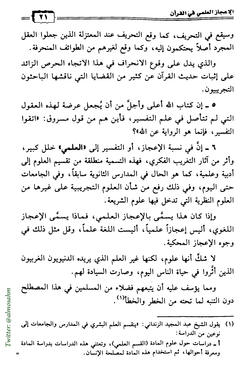 6 - إنَّ في نسبة الإعجاز، أو التفسير إلى «العلمي» خلل كبير، وأثر من آثار التغريب الفكري، فهذه التسمية منطلقة من تقسيم العلوم إلى أدبية وعلمية، كما هو الحال في المدارس الثانوية سابقاً، وفي الجامعات حتى اليوم، وفي ذلك رفع من شأن العلوم التجريبية على غيرها من العلوم النظرية التي تدخل فيها علوم الشريعة.