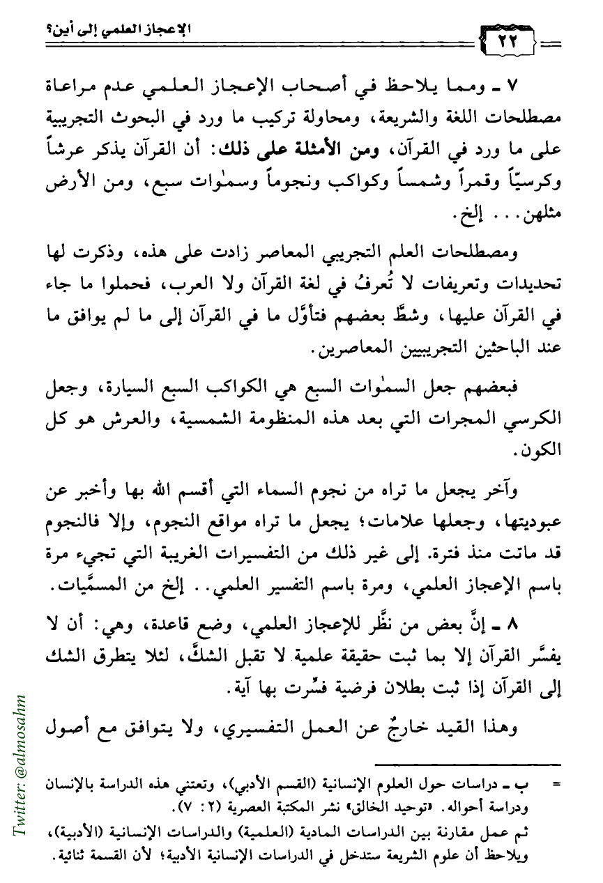 7 - ومما يلاحظ في أصحاب الإعجاز العلمي عدم مراعاة مصطلحات اللغة والشريعة، ومحاولة تركيب ما ورد في البحوث التجريبية على ما ورد في القرآن، ومن الأمثلة على ذلك: أن القرآن يذكر عرشاً وكرسيّاً وقمراً وشمساً وكواكب ونجوماً وسموات سبع، ومن الأرض مثلهن ... إلخ.