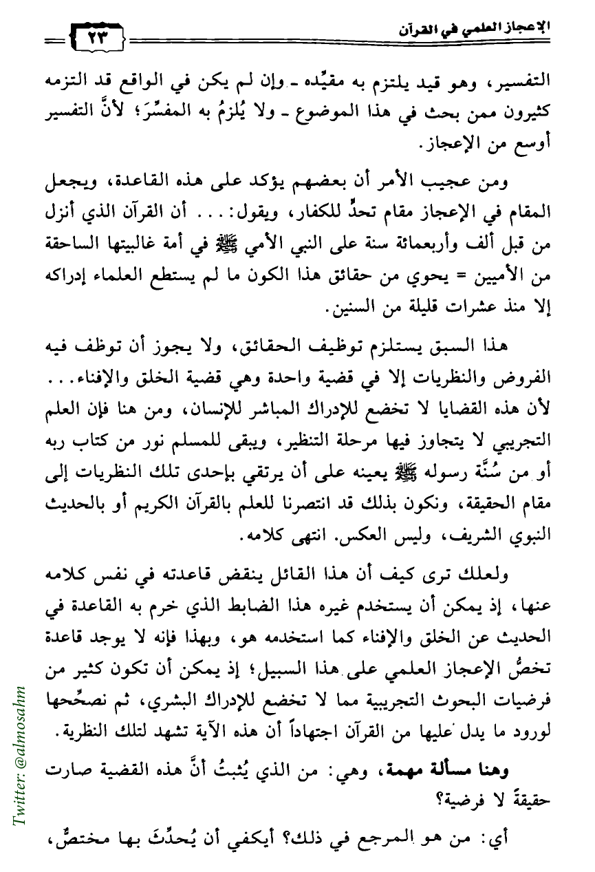 ولعلك ترى كيف أن هذا القائل ينقض قاعدته في نفس كلامه عنها، إذ يمكن أن يستخدم غيره هذا الضابط الذي خرم به القاعدة في الحديث عن الخلق والإفناء كما استخدمه هو، وبهذا فإنه لا يوجد قاعدة تخصُّ الإعجاز العلمي على هذا السبيل؛ إذ يمكن أن تكون كثير من فرضيات البحوث التجريبية مما لا تخضع للإدراك البشري، ثم نصحِّحها لورود ما يدل عليها من القرآن اجتهاداً أن هذه الآية تشهد لتلك النظرية.