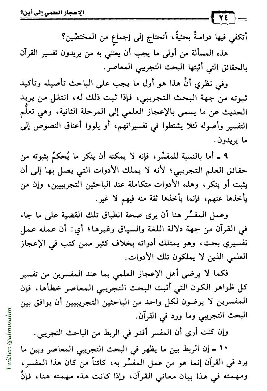 وفي نظري أنَّ هذا هو أول ما يجب على الباحث تأصيله وتأكيد ثبوته من جهة البحث التجريبي، فإذا ثبت ذلك له، انتقل من يريد الحديث عن ما يسمى بالإعجاز العلمي إلى المرحلة الثانية، وهي تعلُّم التفسير وأصوله لئلا يشتطوا في تفسيراتهم، أو يلووا أعناق النصوص إلى ما يريدون.