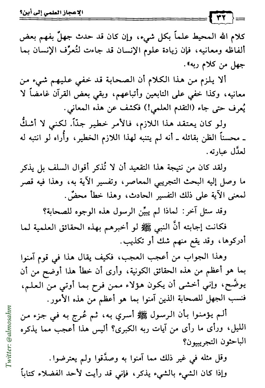 ألا يلزم من هذا الكلام أن الصحابة قد خفي عليهم شيء من معانيه، وكذا خفي على التابعين وأتباعهم، وبقي بعض القرآن غامضاً لا يُعرف حتى جاء (التقدم العلمي!) فكشف عن هذه المعاني.