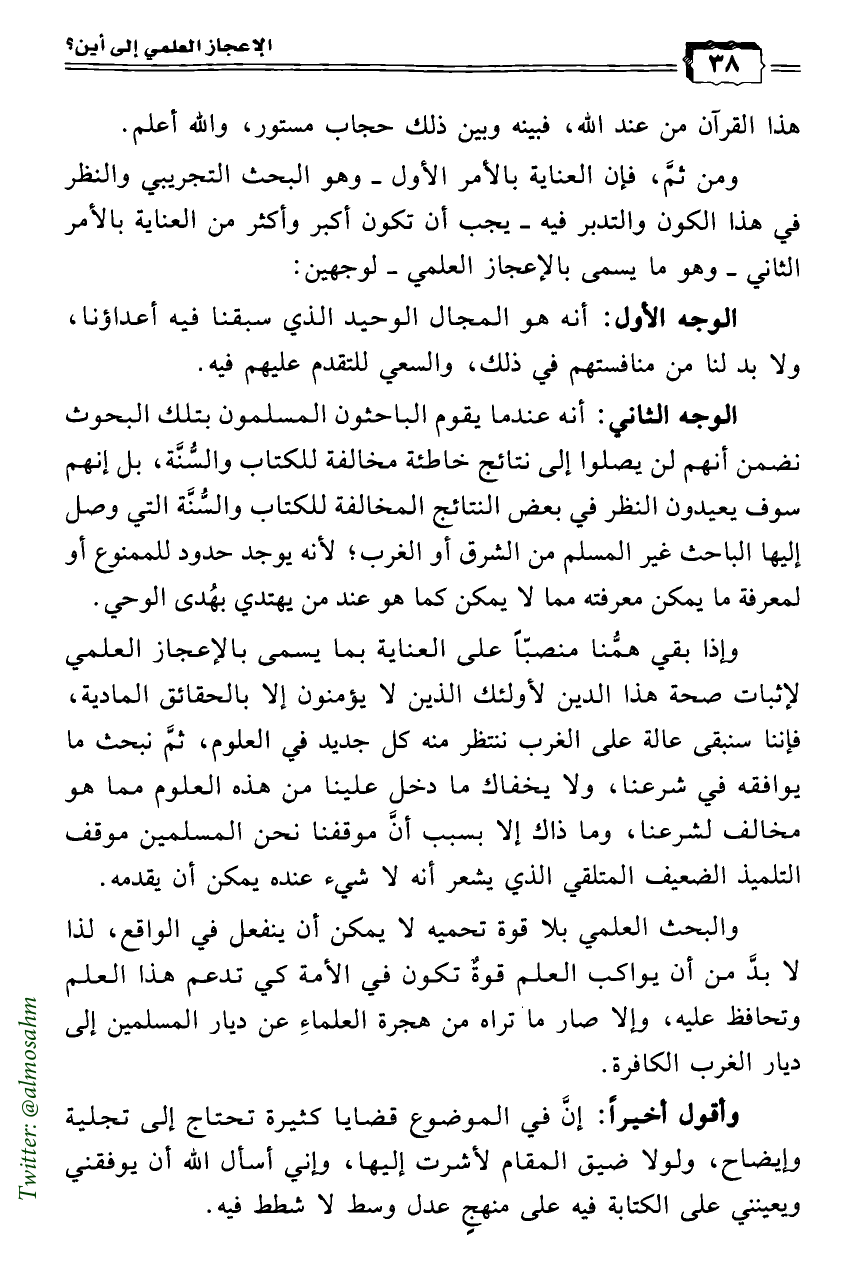 وإذا بقي همُّنا منصبّاً على العناية بما يسمى بالإعجاز العلمي لإثبات صحة هذا الدين لأولئك الذين لا يؤمنون إلا بالحقائق المادية، فإننا سنبقى عالة على الغرب ننتظر منه كل جديد في العلوم، ثمَّ نبحث ما يوافقه في شرعنا، ولا يخفاك ما دخل علينا من هذه العلوم مما هو مخالف لشرعنا، وما ذاك إلا بسبب أنَّ موقفنا نحن المسلمين موقف التلميذ الضعيف المتلقي الذي يشعر أنه لا شيء عنده يمكن أن يقدمه.