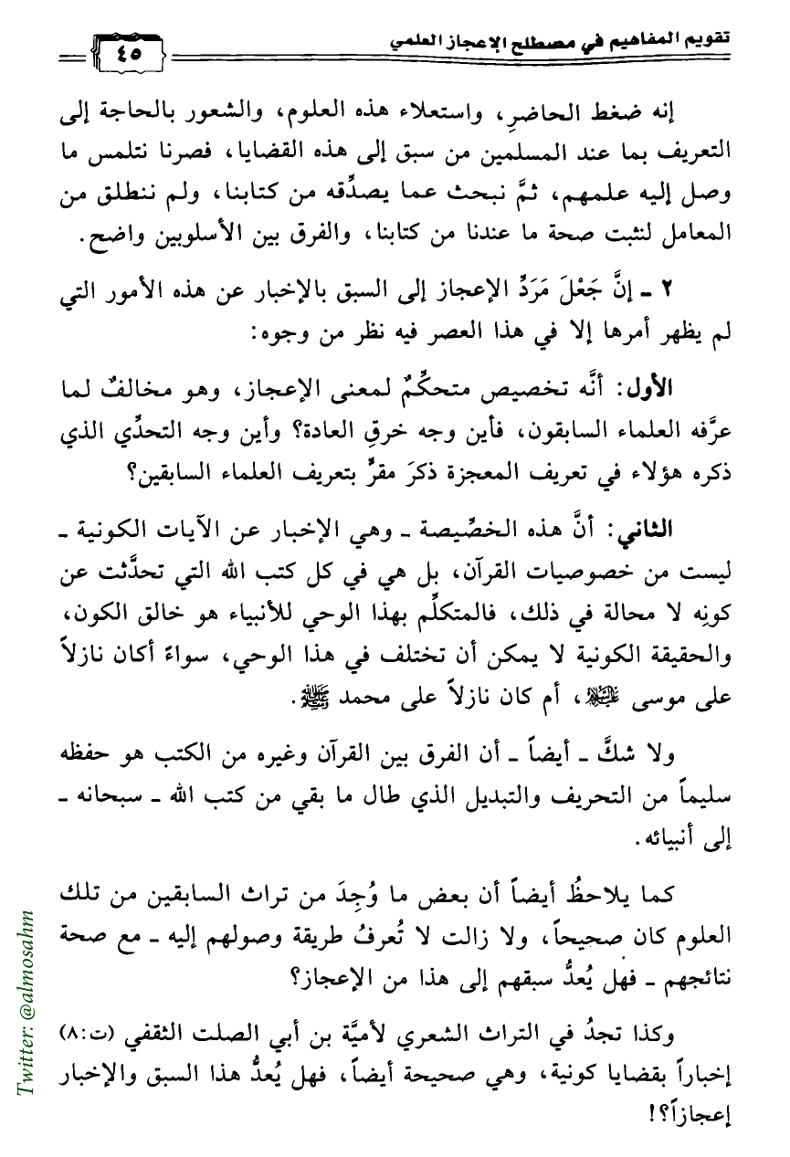 إنه ضغط الحاضرِ، واستعلاء هذه العلوم، والشعور بالحاجة إلى التعريف بما عند المسلمين من سبق إلى هذه القضايا، فصرنا نتلمس ما وصل إليه علمهم، ثمَّ نبحث عما يصدِّقه من كتابنا، ولم ننطلق من المعامل لنثبت صحة ما عندنا من كتابنا، والفرق بين الأسلوبين واضح.