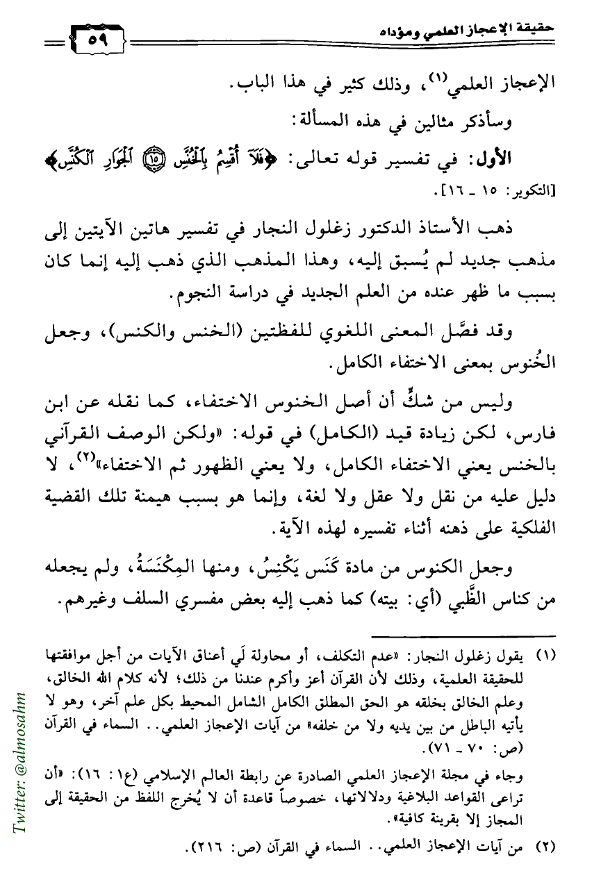 (¬1) يقول زغلول النجار: «عدم التكلف، أو محاولة لَي أعناق الآيات من أجل موافقتها للحقيقة العلمية، وذلك لأن القرآن أعز وأكرم عندنا من ذلك؛ لأنه كلام الله الخالق، وعلم الخالق بخلقه هو الحق المطلق الكامل الشامل المحيط بكل علم آخر، وهو لا يأتيه الباطل من بين يديه ولا من خلفه» من آيات الإعجاز العلمي .. السماء في القرآن (ص: 70 - 71).