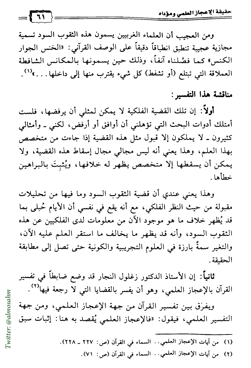 ومن العجيب أن العلماء الغربيين يسمون هذه الثقوب السود تسمية مجازية عجيبة تنطبق انطباقاً دقيقاً على الوصف القرآني: «الخنس الجوار الكنس» كما فصَّلناه آنفاً، وذلك حين يسمونها بالمكانس الشافطة العملاقة التي تبتلع (أو تشفط) كل شيء يقترب منها إلى داخلها ...» (¬1).
