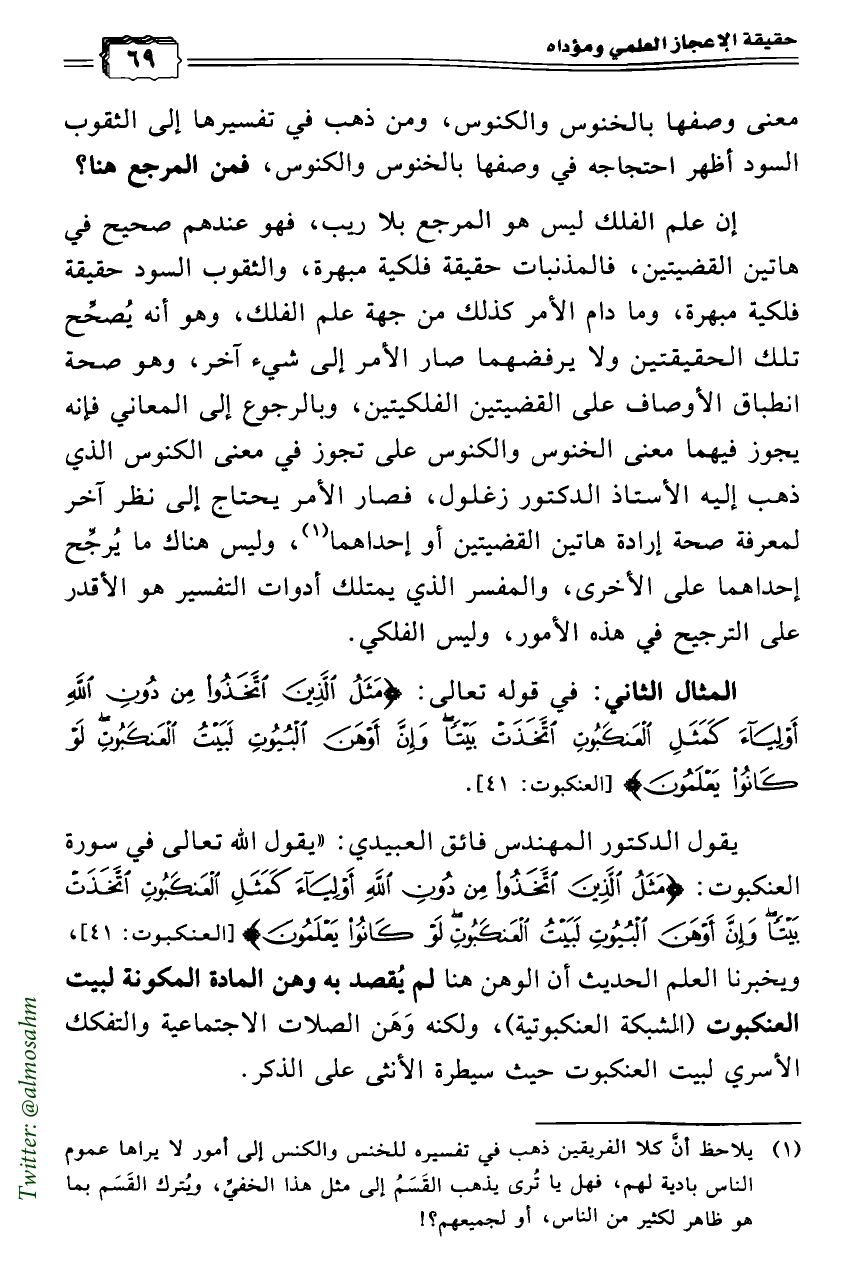إن علم الفلك ليس هو المرجع بلا ريب، فهو عندهم صحيح في هاتين القضيتين، فالمذنبات حقيقة فلكية مبهرة، والثقوب السود حقيقة فلكية مبهرة، وما دام الأمر كذلك من جهة علم الفلك، وهو أنه يُصحِّح تلك الحقيقتين ولا يرفضهما صار الأمر إلى شيء آخر، وهو صحة انطباق الأوصاف على القضيتين الفلكيتين، وبالرجوع إلى المعاني فإنه يجوز فيهما معنى الخنوس والكنوس على تجوز في معنى الكنوس الذي ذهب إليه الأستاذ الدكتور زغلول، فصار الأمر يحتاج إلى نظر آخر لمعرفة صحة إرادة هاتين القضيتين أو إحداهما (¬1)، وليس هناك ما يُرجِّح إحداهما على الأخرى، والمفسر الذي يمتلك أدوات التفسير هو الأقدر على الترجيح في هذه الأمور، وليس الفلكي.