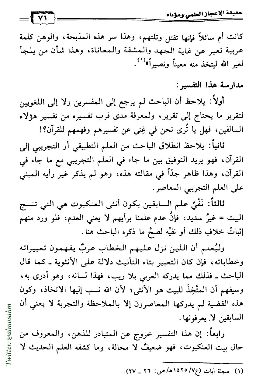 ثالثاً: نَفْيُ علم السابقين بكون أنثى العنكبوت هي التي تنسج البيت = غيرُ سديد، فإنَّ عدم علمنا برأيهم لا يعني العدم، فلو ورد منهم إثباتُ خلافِ ذلك أو نفيُه لصحَّ ما ذكره الباحث هنا.