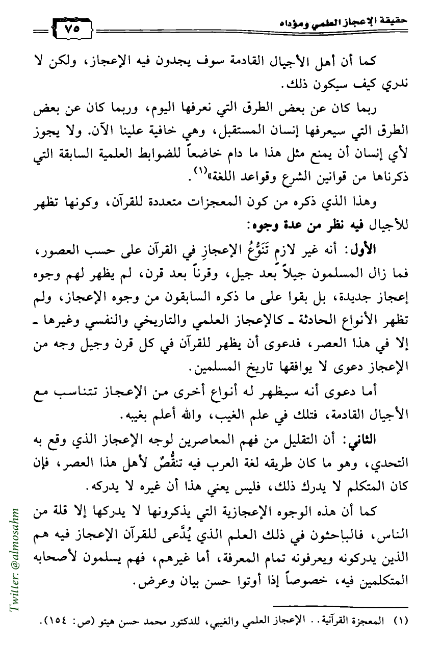 الأول: أنه غير لازمٍ تَنَوُّعُ الإعجازِ في القرآن على حسب العصور، فما زال المسلمون جيلاً بعد جيل، وقرناً بعد قرن، لم يظهر لهم وجوه إعجاز جديدة، بل بقوا على ما ذكره السابقون من وجوه الإعجاز، ولم تظهر الأنواع الحادثة ـ كالإعجاز العلمي والتاريخي والنفسي وغيرها ـ إلا في هذا العصر، فدعوى أن يظهر للقرآن في كل قرن وجيل وجه من الإعجاز دعوى لا يوافقها تاريخ المسلمين.