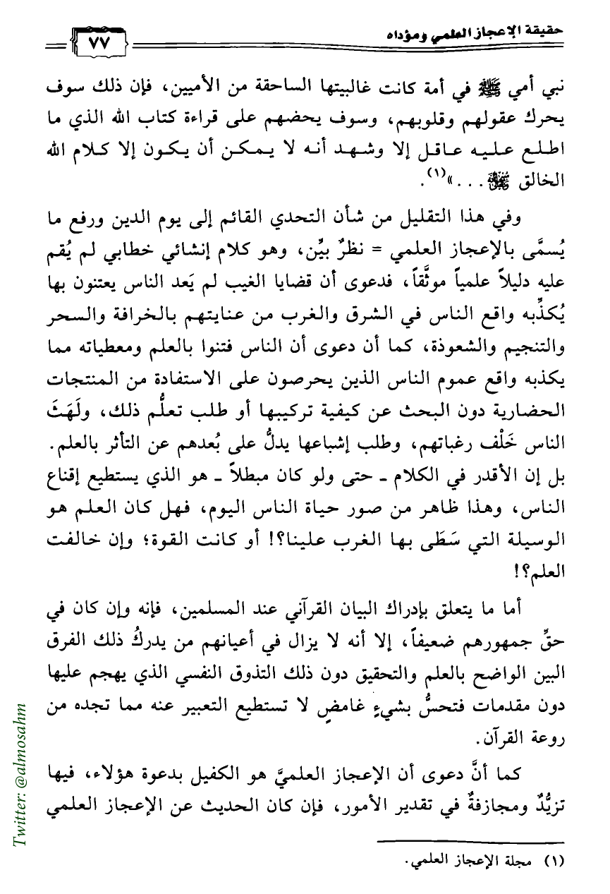 وفي هذا التقليل من شأن التحدي القائم إلى يوم الدين ورفع ما يُسمَّى بالإعجاز العلمي = نظرٌ بيِّن، وهو كلام إنشائي خطابي لم يُقم عليه دليلاً علمياً موثَّقاً، فدعوى أن قضايا الغيب لم يَعد الناس يعتنون بها يُكذِّبه واقع الناس في الشرق والغرب من عنايتهم بالخرافة والسحر والتنجيم والشعوذة، كما أن دعوى أن الناس فتنوا بالعلم ومعطياته مما يكذبه واقع عموم الناس الذين يحرصون على الاستفادة من المنتجات الحضارية دون البحث عن كيفية تركيبها أو طلب تعلُّم ذلك، ولَهَثَ الناس خَلْف رغباتهم، وطلب إشباعها يدلُّ على بُعدهم عن التأثر بالعلم. بل إن الأقدر في الكلام ـ حتى ولو كان مبطلاً ـ هو الذي يستطيع إقناع الناس، وهذا ظاهر من صور حياة الناس اليوم، فهل كان العلم هو الوسيلة التي سَطَى بها الغرب علينا؟! أو كانت القوة؛ وإن خالفت العلم؟!