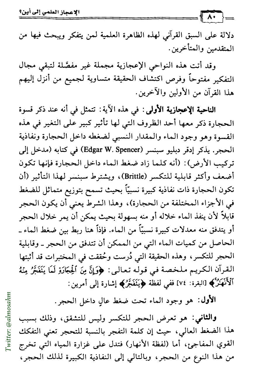 الناحية الإعجازية الأولى: في هذه الآية: تتمثل في أنه عند ذكر قسوة الحجارة ذكر معها أحد الظروف التي لها تأثير كبير على التغير في هذه القسوة وهو وجود الماء والمقدار النسبي لضغطه داخل الحجارة ونفاذية الحجر. يذكر إدقر دبليو سبنسر (Edgar W. Spencer) في كتابه (مدخل إلى تركيب الأرض): (أنه كلما زاد ضغط الماء داخل الحجارة فإنها تكون أضعف وأكثر قابلية للتكسر (Brittle) ، ويشترط سبنسر لهذا التأثير (أن تكون الحجارة ذات نفاذية كبيرة نسبيّاً بحيث تسمح بتوزيع متماثل للضغط في الأجزاء المختلفة من الحجارة)، وهذا الشرط يعني أن يكون الحجر قابلاً لأن ينفذ الماء خلاله أو منه بسهولة بحيث يمكن أن يمر خلال الحجر أو يتدفق منه معدلات كبيرة نسبيّاً من الماء. فإذاً هنا ربط بين ضغط الماء ـ الحاصل من كميات الماء التي من الممكن أن تتدفق من الحجر ـ وقابلية الحجر للتكسر، وهذه الحقيقة التي دُرست وحُققت في المختبرات قد أثبتها القرآن الكريم ملخصة في قوله تعالى: {وَإِنَّ مِنَ الْحِجَارَةِ لَمَا يَتَفَجَّرُ مِنْهُ الأَنْهَارُ} [البقرة: 74] ففي لفظة {يَتَفَجَّرُ} إشارة إلى أمرين: