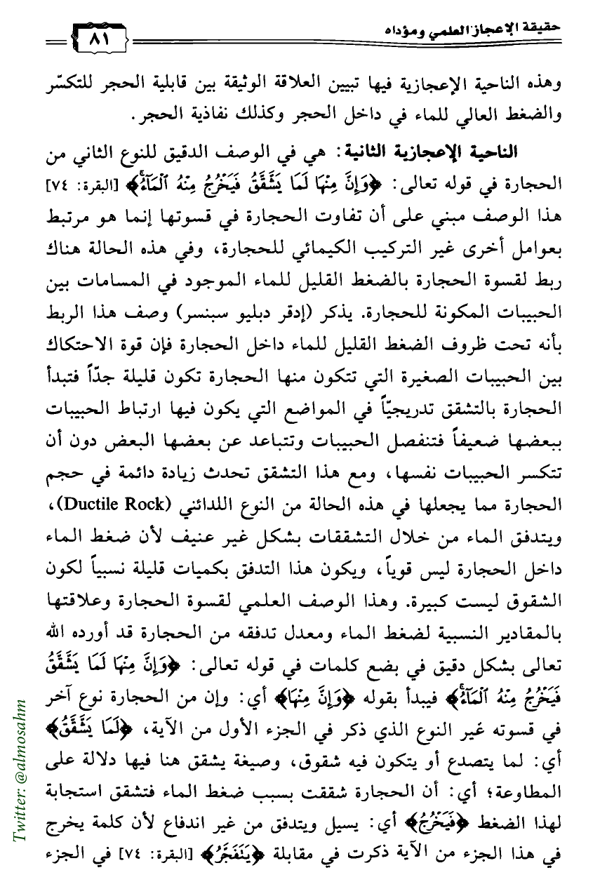وهذه الناحية الإعجازية فيها تبيين العلاقة الوثيقة بين قابلية الحجر للتكسّر والضغط العالي للماء في داخل الحجر وكذلك نفاذية الحجر.