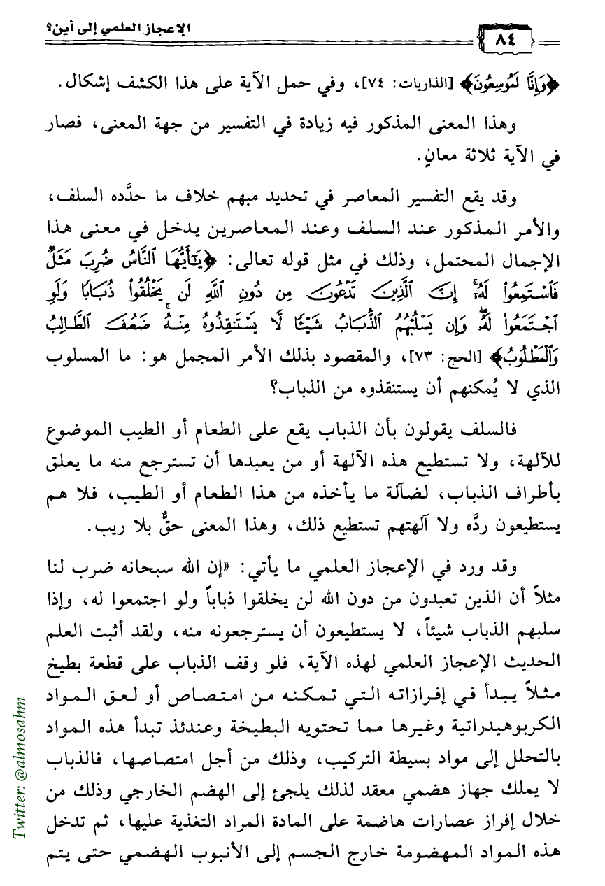 وقد ورد في الإعجاز العلمي ما يأتي: «إن الله سبحانه ضرب لنا مثلاً أن الذين تعبدون من دون الله لن يخلقوا ذباباً ولو اجتمعوا له، وإذا سلبهم الذباب شيئاً، لا يستطيعون أن يسترجعونه منه، ولقد أثبت العلم الحديث الإعجاز العلمي لهذه الآية، فلو وقف الذباب على قطعة بطيخ مثلاً يبدأ في إفرازاته التي تمكنه من امتصاص أو لعق المواد الكربوهيدراتية وغيرها مما تحتويه البطيخة وعندئذ تبدأ هذه المواد بالتحلل إلى مواد بسيطة التركيب، وذلك من أجل امتصاصها، فالذباب لا يملك جهاز هضمي معقد لذلك يلجئ إلى الهضم الخارجي وذلك من خلال إفراز عصارات هاضمة على المادة المراد التغذية عليها، ثم تدخل هذه المواد المهضومة خارج الجسم إلى الأنبوب الهضمي حتى يتم