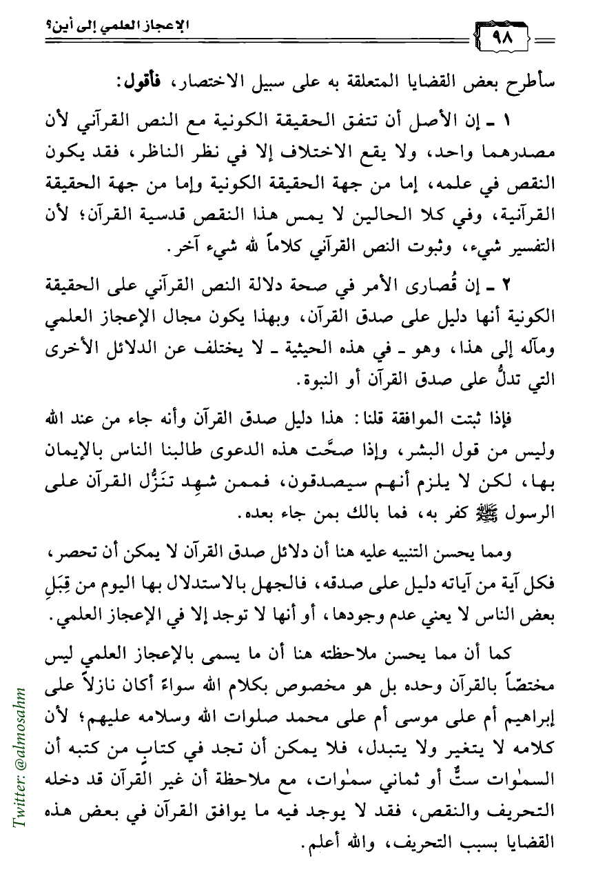 كما أن مما يحسن ملاحظته هنا أن ما يسمى بالإعجاز العلمي ليس مختصّاً بالقرآن وحده بل هو مخصوص بكلام الله سواءً أكان نازلاً على إبراهيم أم على موسى أم على محمد صلوات الله وسلامه عليهم؛ لأن كلامه لا يتغير ولا يتبدل، فلا يمكن أن تجد في كتابٍ من كتبه أن السموات ستٌّ أو ثماني سموات، مع ملاحظة أن غير القرآن قد دخله التحريف والنقص، فقد لا يوجد فيه ما يوافق القرآن في بعض هذه القضايا بسبب التحريف، والله أعلم.