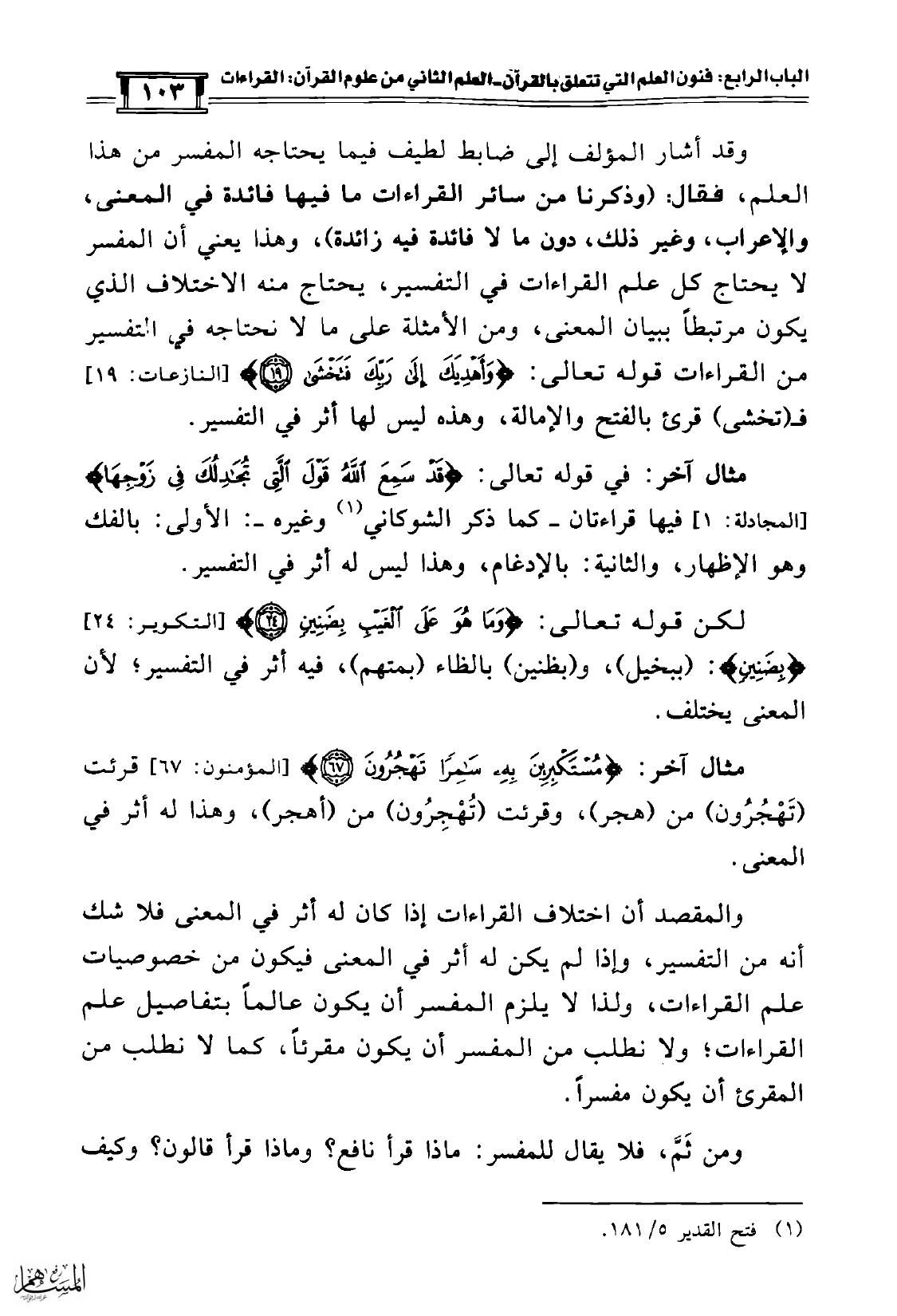 وقد أشار المؤلف إلى ضابط لطيف فيما يحتاجه المفسر من هذا العلم، فقال: (وذكرنا من سائر القراءات ما فيها فائدة في المعنى، والإعراب، وغير ذلك، دون ما لا فائدة فيه زائدة)، وهذا يعني أن المفسر لا يحتاج كل علم القراءات في التفسير، يحتاج منه الاختلاف الذي يكون مرتبطاً ببيان المعنى، ومن الأمثلة على ما لا نحتاجه في التفسير من القراءات قوله تعالى: {وَأَهْدِيَكَ إِلَى رَبِّكَ فَتَخْشَى} [النازعات: 19] فـ (تخشى) قرئ بالفتح والإمالة، وهذه ليس لها أثر في التفسير.