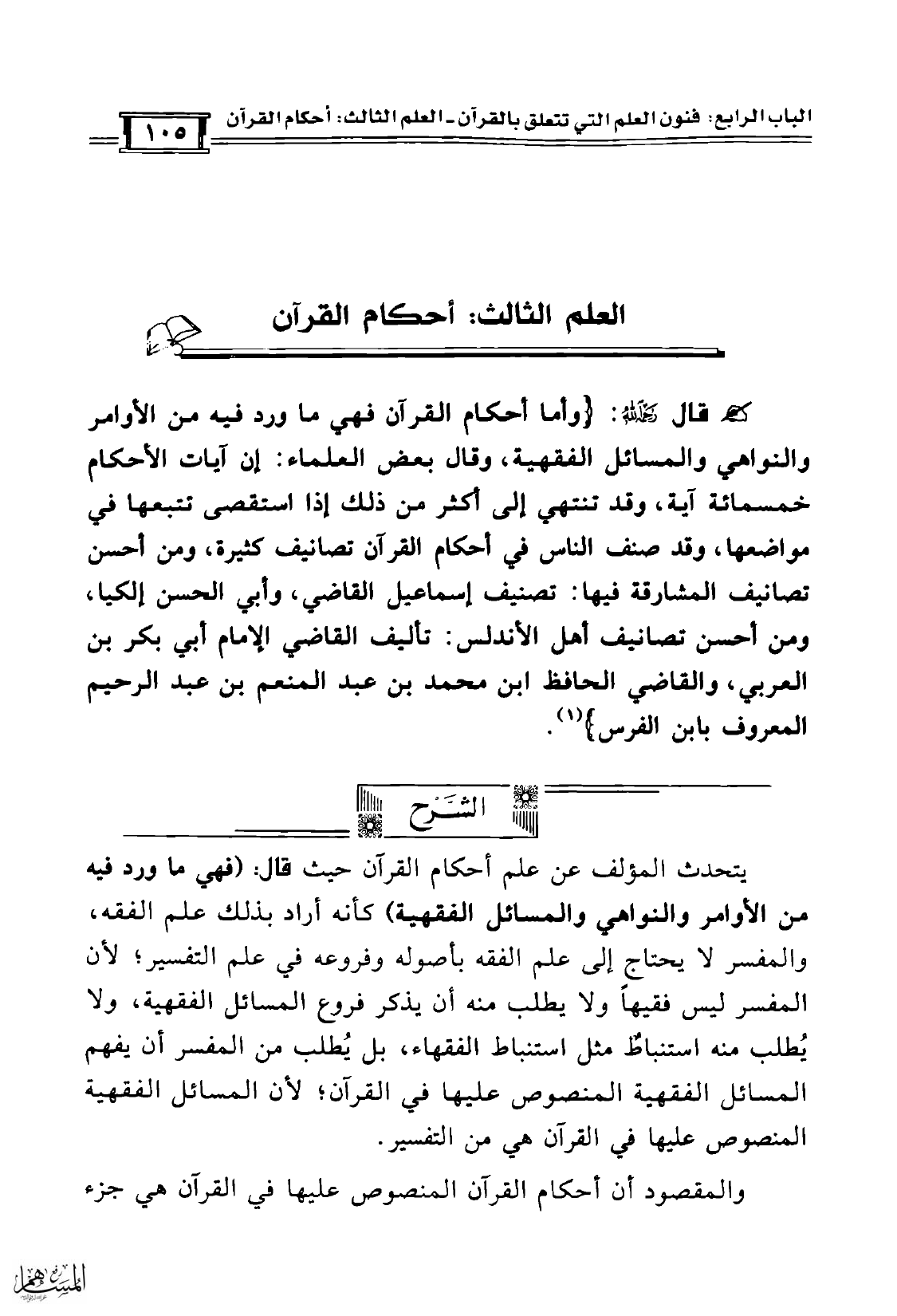 قال رحمه الله: وأما أحكام القرآن فهي ما ورد فيه من الأوامر والنواهي والمسائل الفقهية، وقال بعض العلماء: إن آيات الأحكام خمسمائة آية، وقد تنتهي إلى أكثر من ذلك إذا استقصى تتبعها في مواضعها، وقد صنف الناس في أحكام القرآن تصانيف كثيرة، ومن أحسن تصانيف المشارقة فيها: تصنيف إسماعيل القاضي، وأبي الحسن إلكيا، ومن أحسن تصانيف أهل الأندلس: تأليف القاضي الإمام أبي بكر بن العربي، والقاضي الحافظ ابن محمد بن عبد المنعم بن عبد الرحيم المعروف بابن الفرس (¬1).