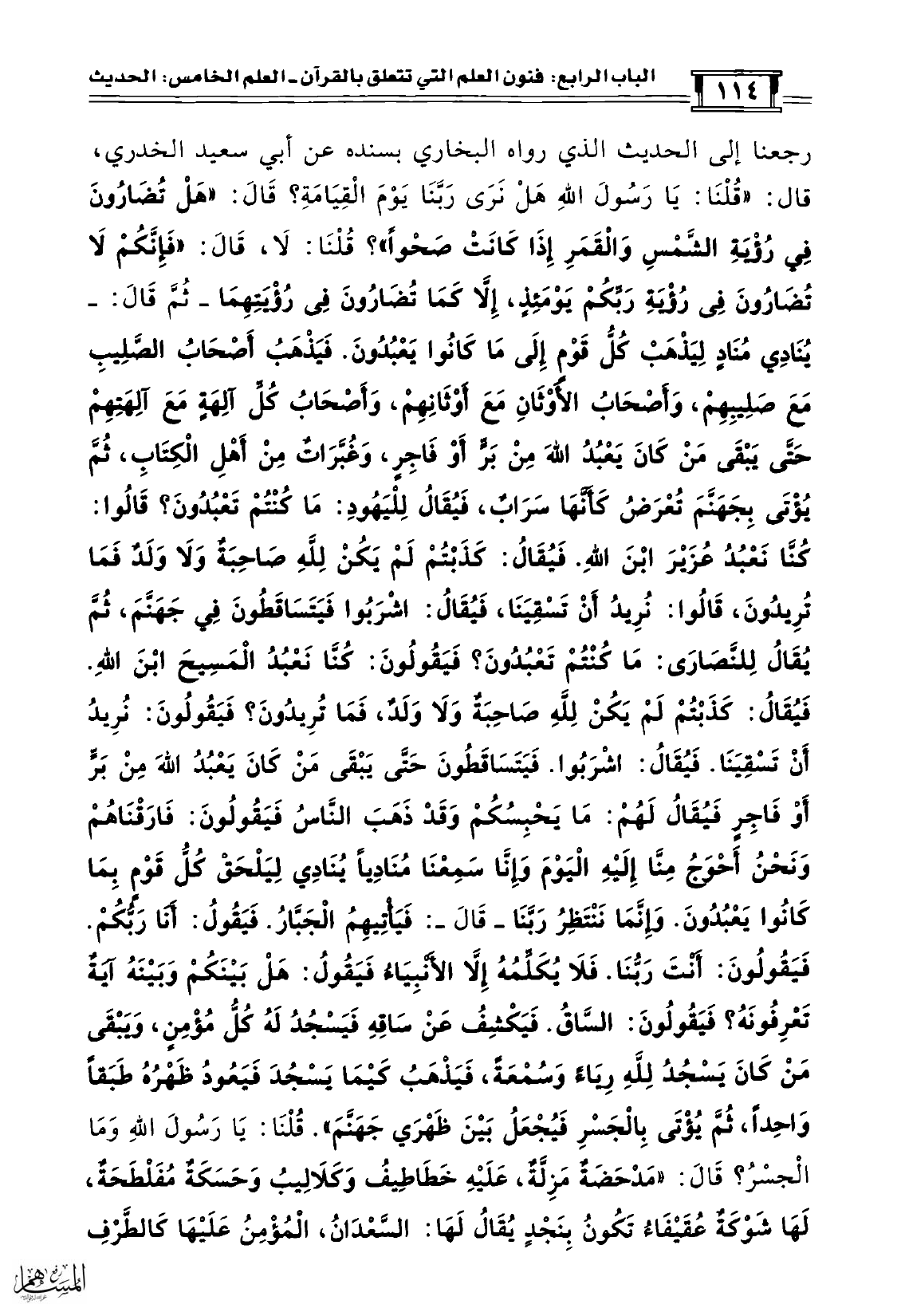 رجعنا إلى الحديث الذي رواه البخاري بسنده عن أبي سعيد الخدري، قال: «قُلْنَا: يَا رَسُولَ اللهِ هَلْ نَرَى رَبَّنَا يَوْمَ الْقِيَامَةِ؟ قَالَ: «هَلْ تُضَارُونَ فِي رُؤْيَةِ الشَّمْسِ وَالْقَمَرِ إِذَا كَانَتْ صَحْواً»؟ قُلْنَا: لاَ، قَالَ: «فَإِنَّكُمْ لاَ تُضَارُونَ فِى رُؤْيَةِ رَبِّكُمْ يَوْمَئِذٍ، إِلاَّ كَمَا تُضَارُونَ فِى رُؤْيَتِهِمَا ـ ثُمَّ قَالَ: ـ يُنَادِي مُنَادٍ لِيَذْهَبْ كُلُّ قَوْمٍ إِلَى مَا كَانُوا يَعْبُدُونَ. فَيَذْهَبُ أَصْحَابُ الصَّلِيبِ مَعَ صَلِيبِهِمْ، وَأَصْحَابُ الأَوْثَانِ مَعَ أَوْثَانِهِمْ، وَأَصْحَابُ كُلِّ آلِهَةٍ مَعَ آلِهَتِهِمْ حَتَّى يَبْقَى مَنْ كَانَ يَعْبُدُ اللهَ مِنْ بَرٍّ أَوْ فَاجِرٍ، وَغُبَّرَاتٌ مِنْ أَهْلِ الْكِتَابِ، ثُمَّ يُؤْتَى بِجَهَنَّمَ تُعْرَضُ كَأَنَّهَا سَرَابٌ، فَيُقَالُ لِلْيَهُودِ: مَا كُنْتُمْ تَعْبُدُونَ؟ قَالُوا: كُنَّا نَعْبُدُ عُزَيْرَ ابْنَ اللهِ. فَيُقَالُ: كَذَبْتُمْ لَمْ يَكُنْ لِلَّهِ صَاحِبَةٌ وَلاَ وَلَدٌ فَمَا تُرِيدُونَ، قَالُوا: نُرِيدُ أَنْ تَسْقِيَنَا، فَيُقَالُ: اشْرَبُوا فَيَتَسَاقَطُونَ فِي جَهَنَّمَ، ثُمَّ يُقَالُ لِلنَّصَارَى: مَا كُنْتُمْ تَعْبُدُونَ؟ فَيَقُولُونَ: كُنَّا نَعْبُدُ الْمَسِيحَ ابْنَ اللهِ. فَيُقَالُ: كَذَبْتُمْ لَمْ يَكُنْ لِلَّهِ صَاحِبَةٌ وَلاَ وَلَدٌ، فَمَا تُرِيدُونَ؟ فَيَقُولُونَ: نُرِيدُ أَنْ تَسْقِيَنَا. فَيُقَالُ: اشْرَبُوا.