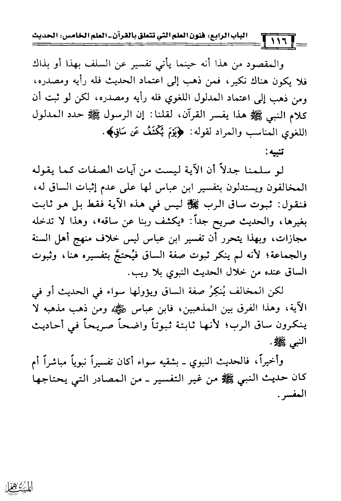 والمقصود من هذا أنه حينما يأتي تفسير عن السلف بهذا أو بذاك فلا يكون هناك نكير، فمن ذهب إلى اعتماد الحديث فله رأيه ومصدره، ومن ذهب إلى اعتماد المدلول اللغوي فله رأيه ومصدره، لكن لو ثبت أن كلام النبي صلّى الله عليه وسلّم هذا يفسر القرآن، لقلنا: إن الرسول صلّى الله عليه وسلّم حدد المدلول اللغوي المناسب والمراد لقوله: {يَوْمَ يُكْشَفُ عَنْ سَاقٍ}.