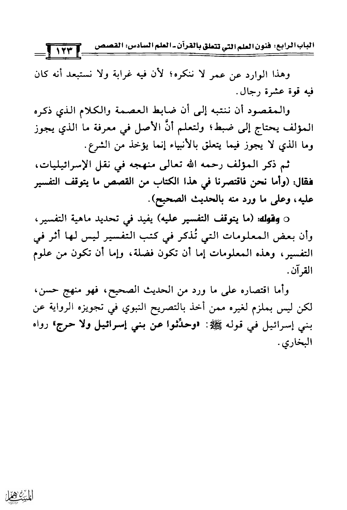 وأما اقتصاره على ما ورد من الحديث الصحيح، فهو منهج حسن، لكن ليس بملزم لغيره ممن أخذ بالتصريح النبوي في تجويزه الرواية عن بني إسرائيل في قوله صلّى الله عليه وسلّم: «وحدِّثوا عن بني إسرائيل ولا حرج» رواه البخاري.