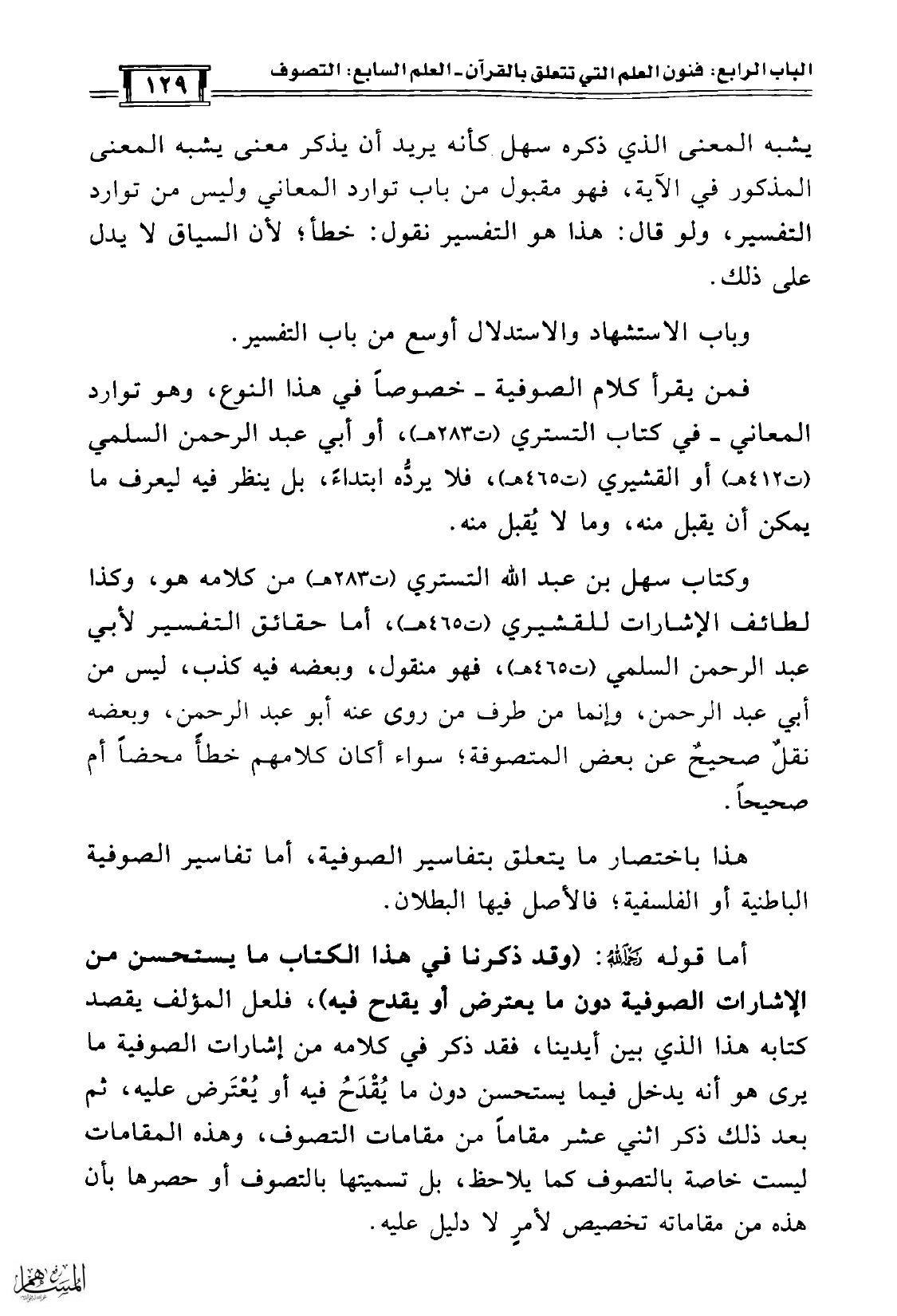 وكتاب سهل بن عبد الله التستري (ت283هـ) من كلامه هو، وكذا لطائف الإشارات للقشيري (ت465هـ)، أما حقائق التفسير لأبي عبد الرحمن السلمي (ت465هـ)، فهو منقول، وبعضه فيه كذب، ليس من أبي عبد الرحمن، وإنما من طرف من روى عنه أبو عبد الرحمن، وبعضه نقلٌ صحيحٌ عن بعض المتصوفة؛ سواء أكان كلامهم خطأً محضاً أم صحيحاً.