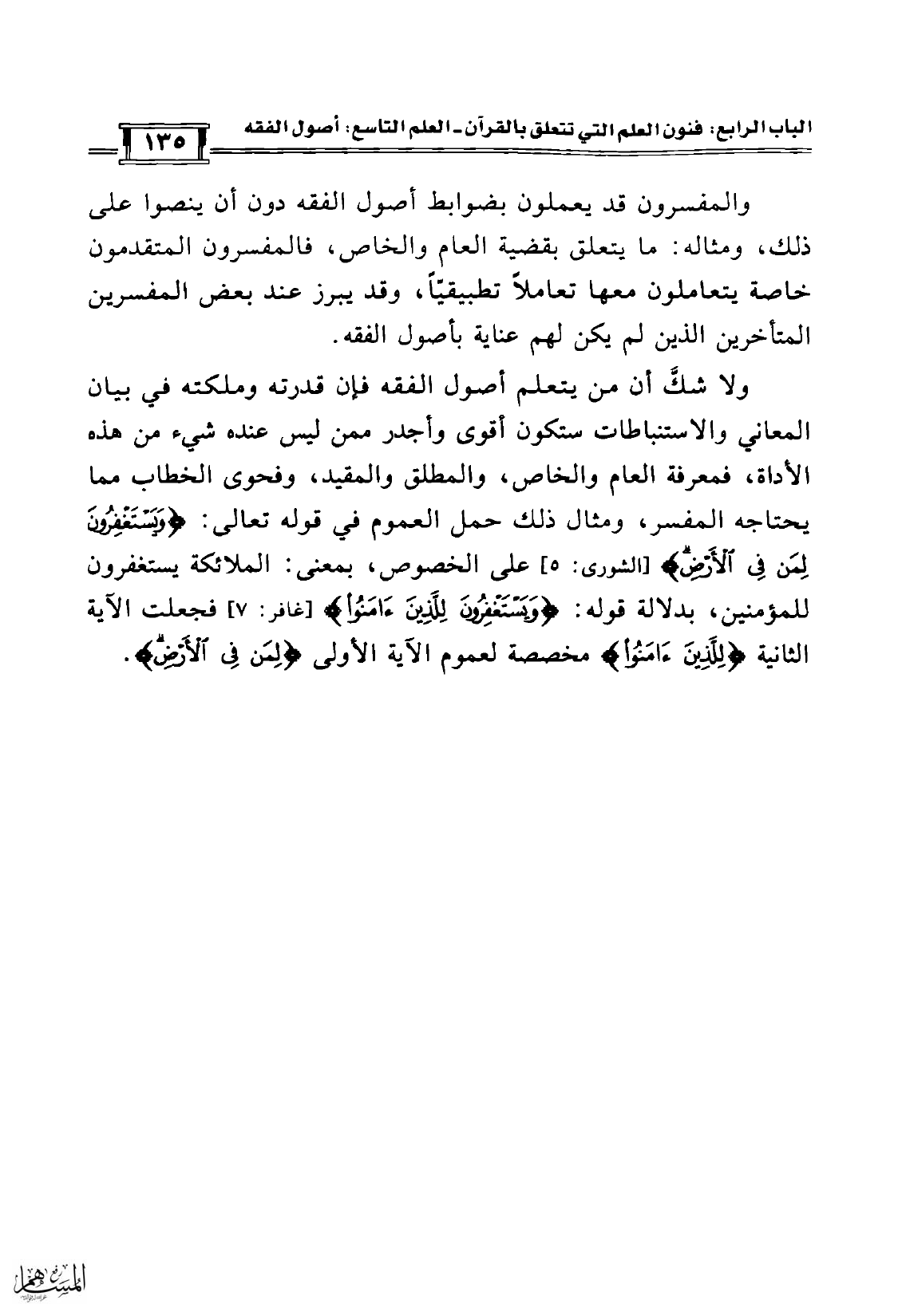 ولا شكَّ أن من يتعلم أصول الفقه فإن قدرته وملكته في بيان المعاني والاستنباطات ستكون أقوى وأجدر ممن ليس عنده شيء من هذه الأداة، فمعرفة العام والخاص، والمطلق والمقيد، وفحوى الخطاب مما يحتاجه المفسر، ومثال ذلك حمل العموم في قوله تعالى: {وَيَسْتَغْفِرُونَ لِمَنْ فِي الأَرْضِ} [الشورى: 5] على الخصوص، بمعنى: الملائكة يستغفرون للمؤمنين، بدلالة قوله: {وَيَسْتَغْفِرُونَ لِلَّذِينَ آمَنُوا} [غافر: 7] فجعلت الآية الثانية {وَيَسْتَغْفِرُونَ لِلَّذِينَ آمَنُوا} مخصصة لعموم الآية الأولى {وَيَسْتَغْفِرُونَ لِمَنْ فِي الأَرْضِ}.