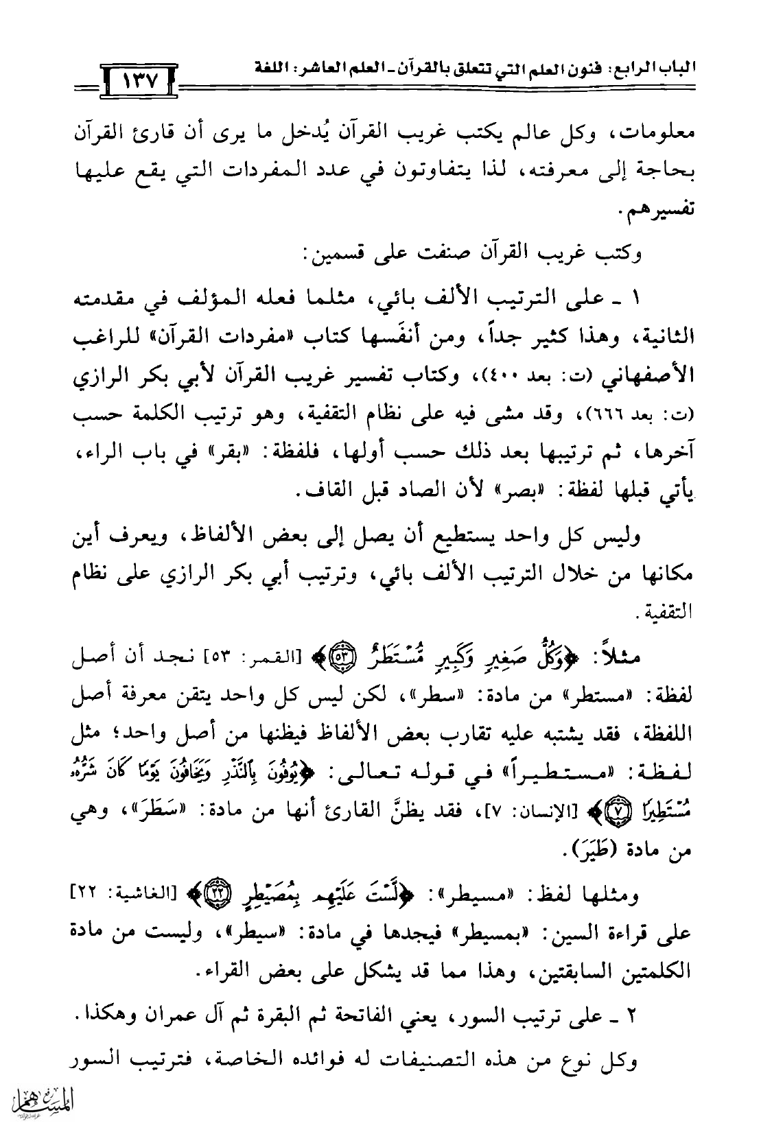 1 - على الترتيب الألف بائي، مثلما فعله المؤلف في مقدمته الثانية، وهذا كثير جداً، ومن أنفَسها كتاب «مفردات القرآن» للراغب الأصفهاني (ت: بعد 400)، وكتاب تفسير غريب القرآن لأبي بكر الرازي (ت: بعد 666)، وقد مشى فيه على نظام التقفية، وهو ترتيب الكلمة حسب آخرها، ثم ترتيبها بعد ذلك حسب أولها، فلفظة: «بقر» في باب الراء، يأتي قبلها لفظة: «بصر» لأن الصاد قبل القاف.